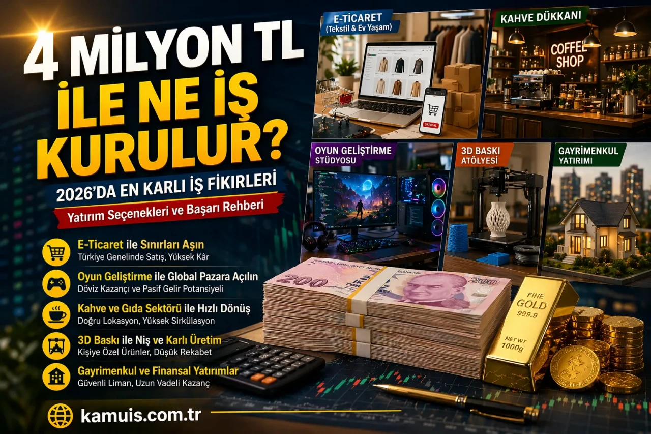 4 milyon TL sermaye ile 2026 yılında e-ticaret, kahve dükkanı, 3D baskı atölyesi ve gayrimenkul yatırımı gibi birçok karlı iş kurulabiliyor. Doğru sektör ve planlama ile hem aktif hem pasif gelir elde etmek mümkün.
