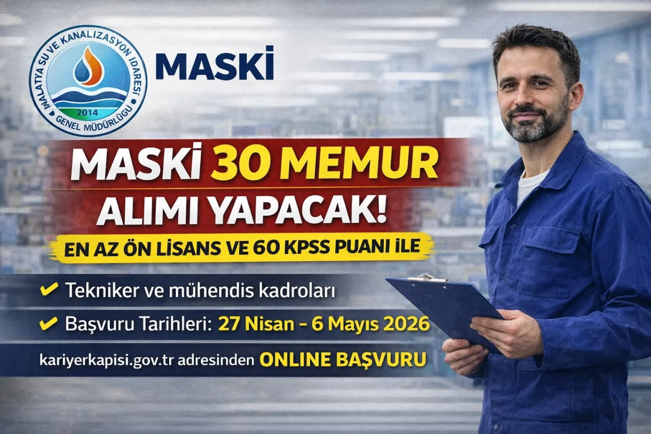 MASKİ 30 Memur Alımı Yapacak! 60 KPSS Puanı Yeterli Kamuya memur olmak isteyen adaylar için yeni bir fırsat duyuruldu. Malatya Su ve Kanalizasyon İdaresi, yayımladığı ilan ile en az 60 KPSS puanı şartıyla toplam 30 memur alımı gerçekleştireceğini açıkladı. Alımlar, teknik hizmetler sınıfında ve farklı mühendislik ile tekniker kadrolarında yapılacak.