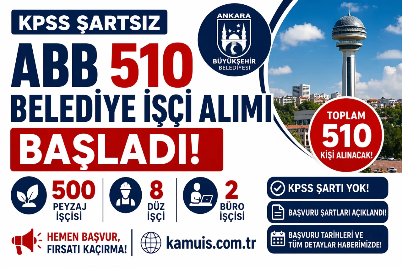 Ankara Büyükşehir Belediyesi 510 işçi alımı yapıyor. KPSS şartı yok! Kadrolar, başvuru şartları, maaşlar ve tüm detaylar bu haberde.