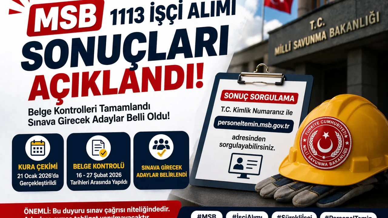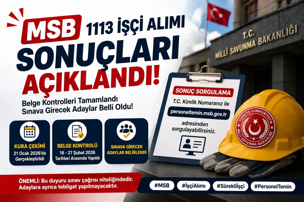 MSB 1113 İşçi Alımı Sonuçları Açıklandı! Sınava Girecek Adaylar Belli Oldu Millî Savunma Bakanlığı (Millî Savunma Bakanlığı) tarafından yürütülen 1113 sürekli işçi alımı sürecinde önemli bir aşama tamamlandı. Şubat 2026’da gerçekleştirilen belge kontrollerinin ardından, sınava katılacak aday listesi netleşti.
