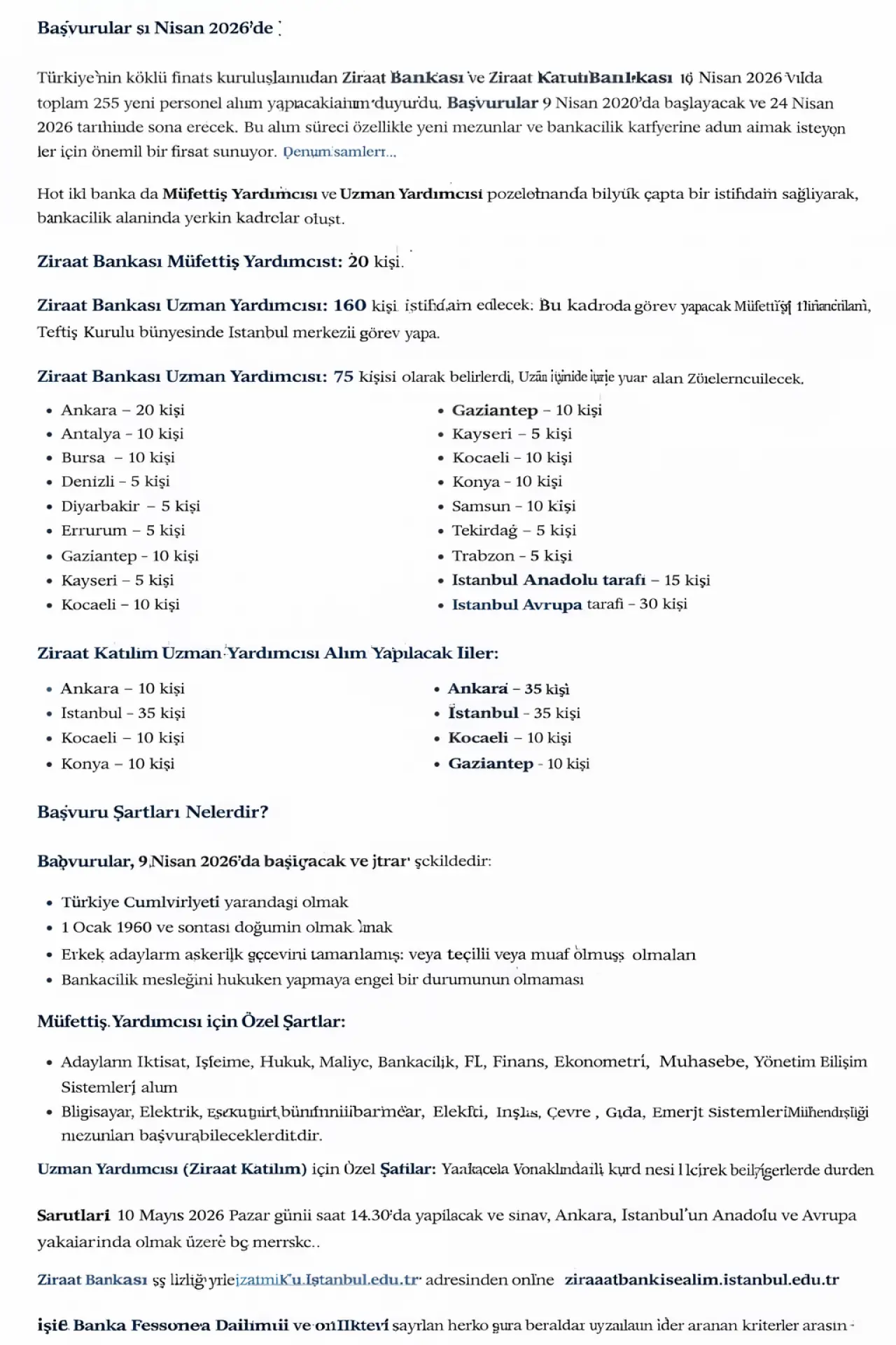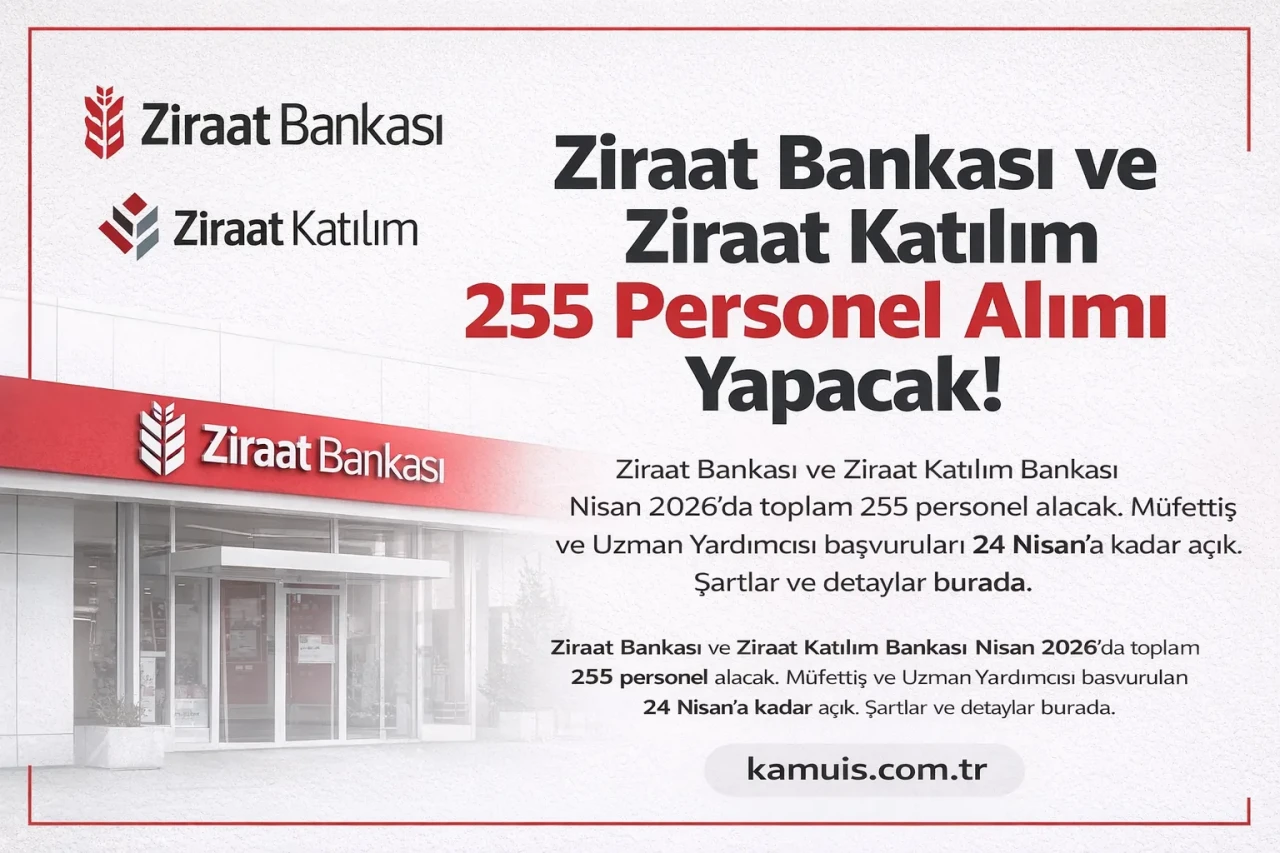 Başladı Ziraat Bankası ve Ziraat Katılım Bankası, 2026 yılı için merakla beklenen personel alımı ilanını yayımladı. İki köklü banka tarafından yapılan duyuruya göre toplamda 255 kişilik kadro açıldı. Alımlar Müfettiş Yardımcısı ve Uzman Yardımcısı pozisyonlarında gerçekleştirilecek. Başvuru süreci 9 Nisan 2026 tarihinde başladı ve 24 Nisan 2026 saat 23.59’a kadar devam edecek. Bankacılık sektöründe kariyer hedefleyen adaylar için önemli bir fırsat sunuluyor