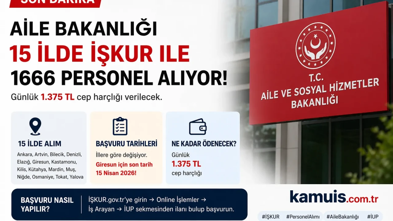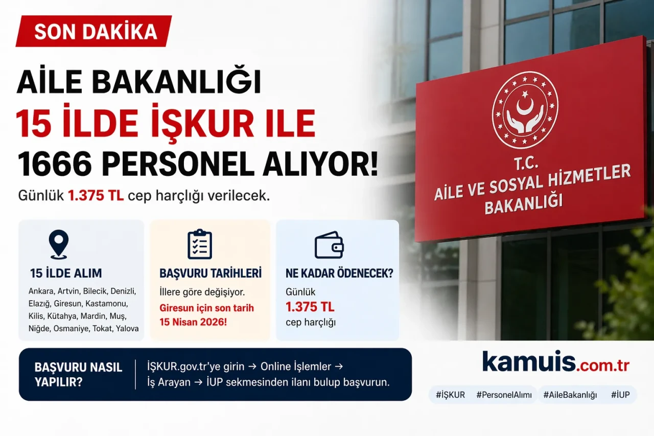 Aile Bakanlığı, 15 ilde toplam 1666 personel alımı yapıyor. Başvurular İŞKUR üzerinden ve son tarih illere göre değişiyor.