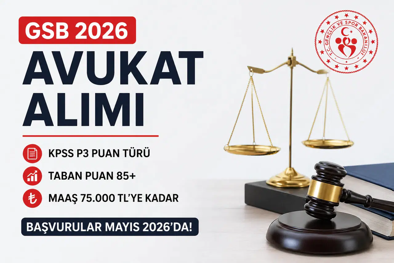 GSB 2026 avukat alımı için geri sayım başladı. Baro kaydı zorunlu olurken, KPSS P3 puanıyla başvuru yapılacak. Taban puanın 85+ seviyelerinde oluşması bekleniyor. Maaşlar ise 75 bin TL’ye kadar çıkıyor. Başvuruların Mayıs 2026’da Kariyer Kapısı üzerinden alınması öngörülüyor.
