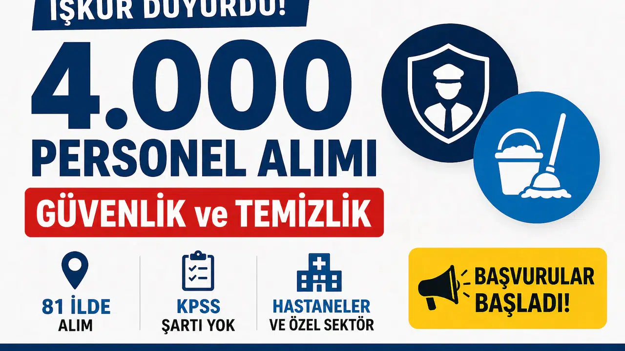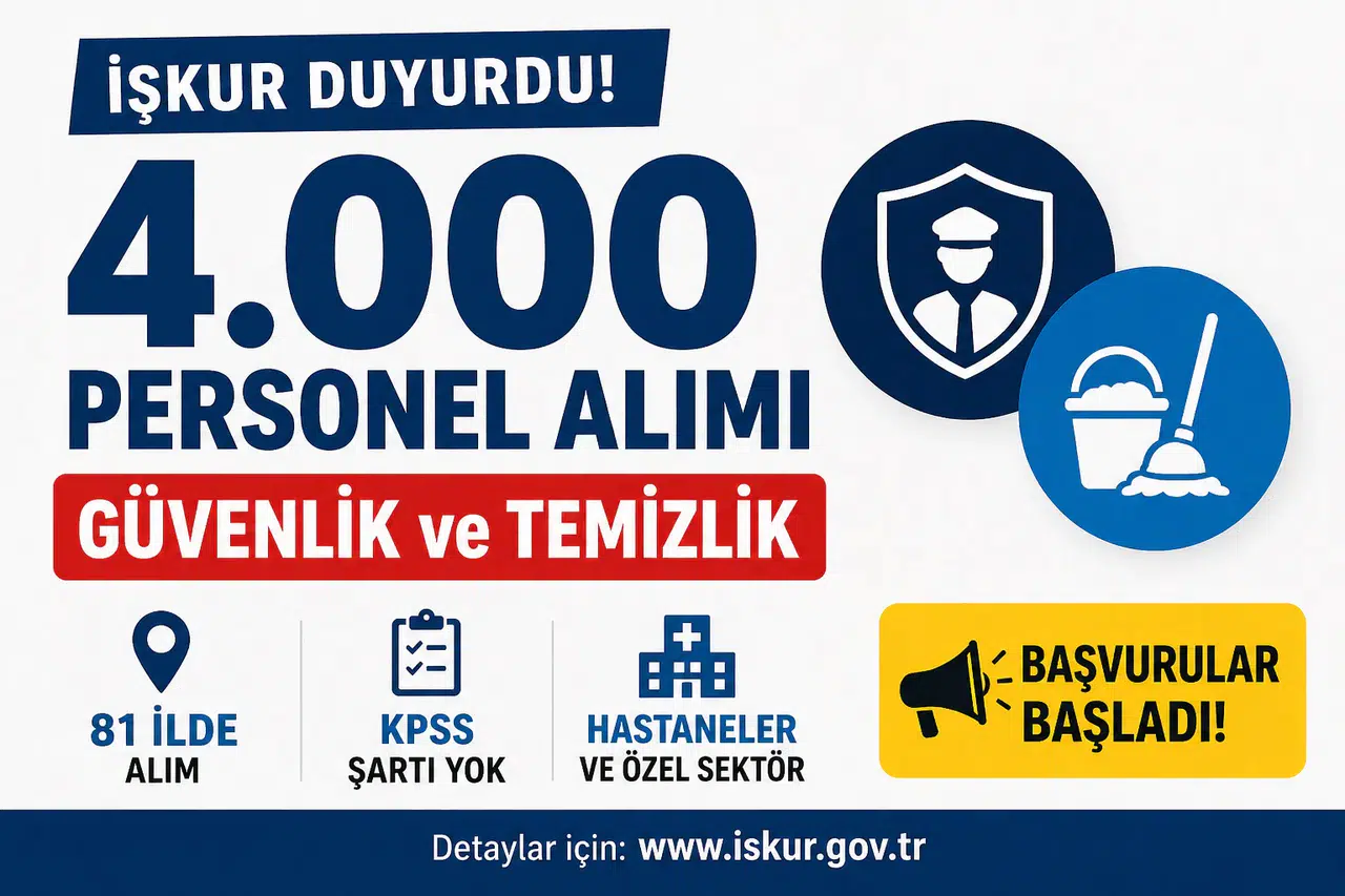 İŞKUR’dan Dev Alım: Hastaneler ve Özel Sektöre 4.000 Güvenlik ve Temizlik Personeli Alınacak!Türkiye İş Kurumu tarafından yayımlanan yeni ilanlar, iş arayanlar için önemli bir fırsat sundu. Türkiye genelinde kamu ve özel sektörde görevlendirilmek üzere toplam 4.000 güvenlik görevlisi ve temizlik personeli alımı yapılacağı duyuruldu. Üstelik bu alımlarda KPSS şartı aranmayacak.