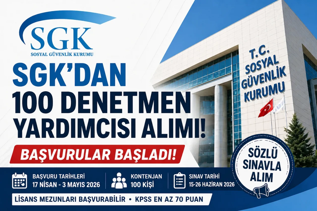 SGK, 2026 yılı için 100 denetmen yardımcısı alımı yapacak. Başvurular 17 Nisan – 3 Mayıs 2026 tarihleri arasında online olarak alınacak. Adaylardan en az 70 KPSS puanı ve lisans mezuniyeti şartı aranıyor. Sözlü sınavlar Haziran ayında Ankara’da yapılacak.