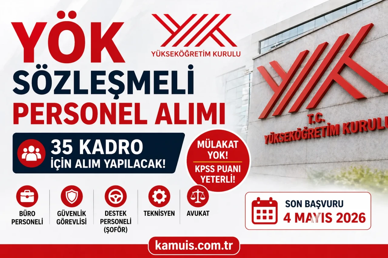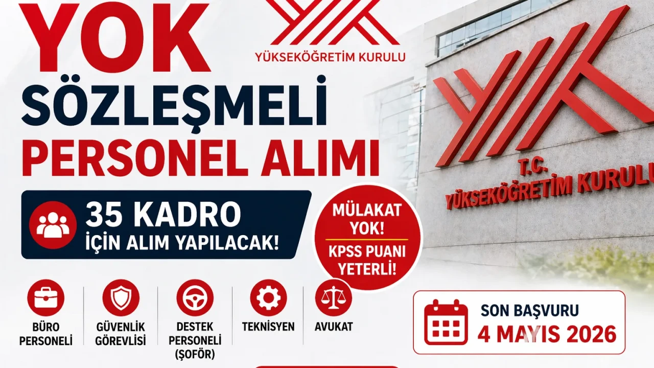 YÖK 2026 Sözleşmeli Personel Alımı Başladı 35 Kadro, Mülakat Yok, KPSS ile Yerleştirme! Yükseköğretim Kurulu (YÖK), 2026 yılı sözleşmeli personel alımı ilanını yayımlayarak kamuya yeni bir istihdam kapısı açtı. 20 Nisan 2026 tarihli ilan kapsamında merkez teşkilatında görevlendirilmek üzere toplam 35 personel alımı yapılacak. En dikkat çeken detay ise mülakat yapılmayacak olması; yerleştirmeler tamamen KPSS puan sıralamasına göre gerçekleştirilecek.